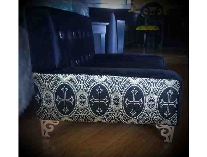 Black velvet with black and gold buttons, black and gold brocade back, ornate metal legs.