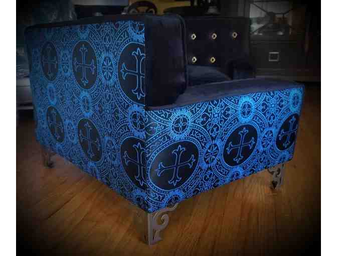 Black and blue brocade, velvet buttons, metal legs.