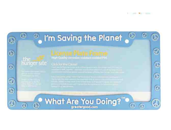 Sturdy, corrosion-resistant molded PVC frame reads, "I'm saving the planet" on the top, and "What are you doing?" on the bottom, along with "GreaterGood.com." A plethora of light blue peace signs decorate the rest of the frame. Four screws (not included) secure it to your vehicle. Frame measures 12.25" L x 6.25"