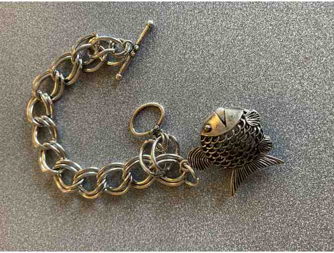 Adorable fish with a pearl in her mouth decorates this link toggle bracelet