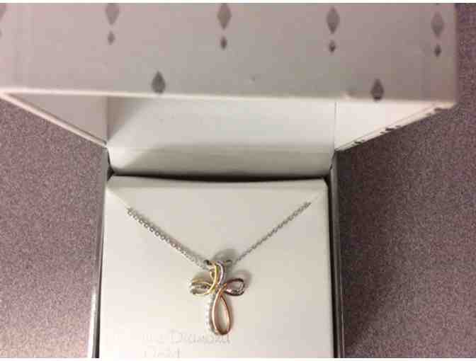 Dainty tricolor gold, rose gold and silver cross 1 inch pendant on a 18 inch sterling silver chain. Cross has a small genuine diamond chip in the center. 18 K gold over silver. Much prettier than what could be captured in a picture. Packaged in a hinged gift box.