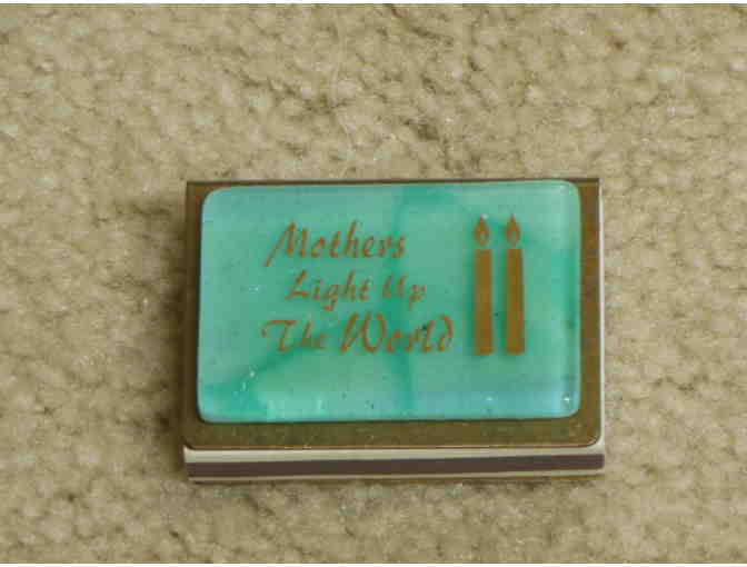 Item Description: About 2" x 1-1/2". Green, "Mothers Light Up the World" with shabbat candles. By Gary Rosenthal.