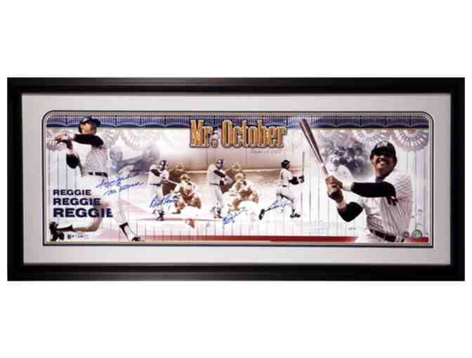 Framed Reggie Jackson with 3 pitchers from the Ocotber 18, 1977 World Series. Print is number 1 of 177. Autographs of Reggie Jackson with Mr. October inscription as well as the three pitchers from his home runs of that game (Burt Hooten, Charlie Hough, and Elias Sosa).