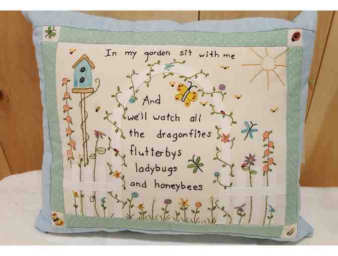 This lovely little pillow is hand-embroidered, hand-tinted, and hand and machine quilted by Karen Treanor-Brown of Rainier, OR.  The short poem is illustrated in needlework with a garden scene of butterflies, dragonflies, bees, and flowers.  Charming!