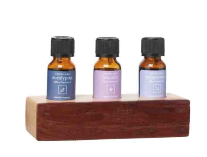 Infuse your living spaces with the natural scents of this Aroma Aria Grey Floral Mood Enhancer diffuser oil set, complete with three bottles of essential oils and a wooden bottle holder.