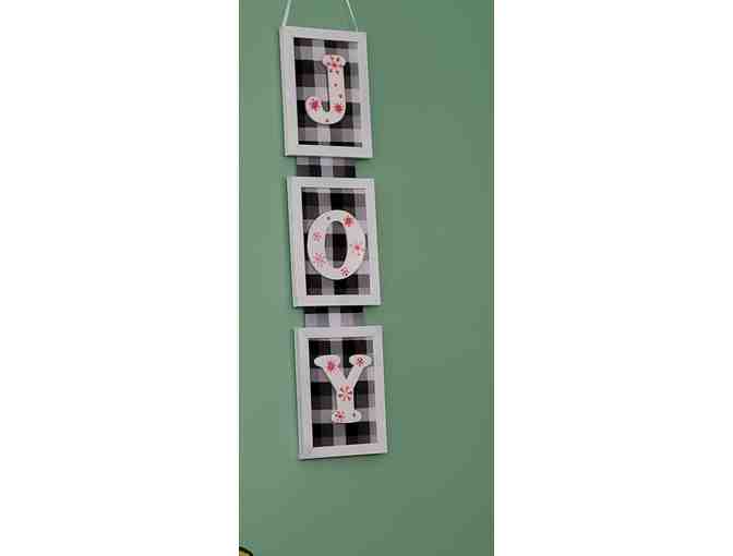 Painted Wooden letters spell "JOY" on a background of gray Buffalo print.