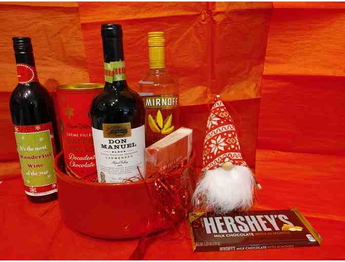 Red Salad Bowl, 2 bottles of wine, 1 bottle vodka, chocolates, cocktail napkins and gnome ornament