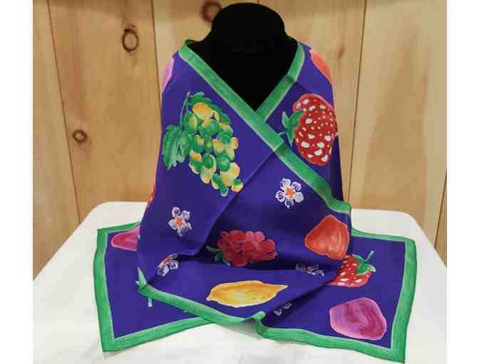 Colorful scarf bears a bold bounty of fruits and flowers, against a purple background with a green trim.