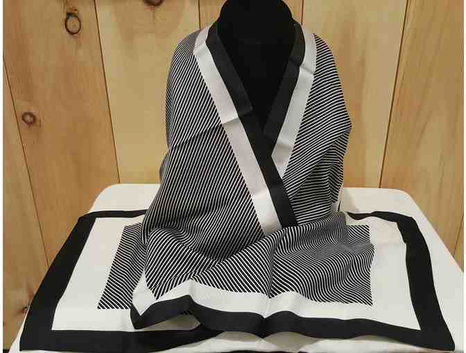 Luxurious 100% silk scarf from Talbots is new, never worn. Fine white stripes on a black background have a double border of generous black and white stripes.