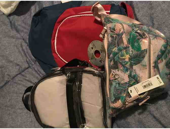 Great item for all your needs we have 1 clear see-thru backpack, 1 red, blue & gray backpack -and- 1 roomy fanny pack w/ a cross strap. All brand new. Original value: $36