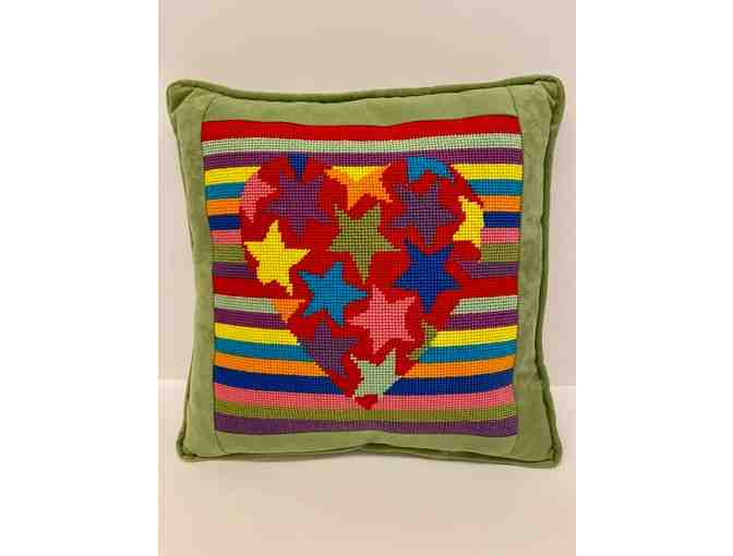 Handmade Needlepoint Pillow. Made and donated by Kathleen Walsh.
