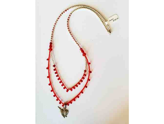 A one-of-a-kind, 24" handmade, layered, necklace of Sterling Silver, Vintage Czech Glass Beads with a Vintage Mexican Sacred Heart Milagro (base metal). The Clasp is Sterling Silver.