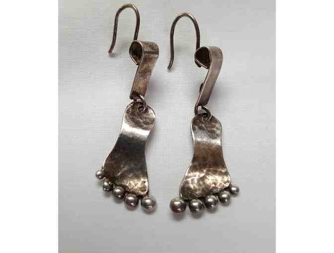 Vintage hooked earrings are handmade of Mexican sterling silver, and stamped Sterling. Measure 1 1/4" from heel to tip of big toe. 5/8" at widest point which is little toe to big toe. Dangle is 1 3/4".