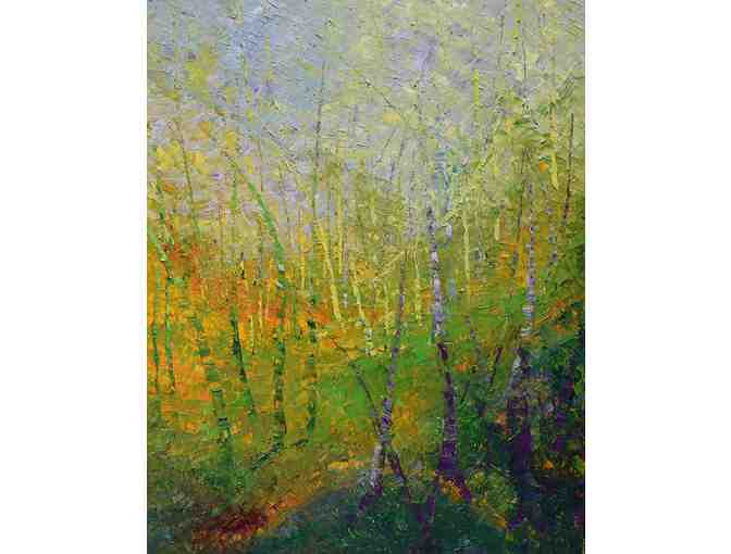 Huge and gorgeous are the words for this vision of young birch trees in the forest. The artist describes the style as impressionistic/abstract, and this work certainly includes both. Ray Paradiso lives and works in Acton, MA.