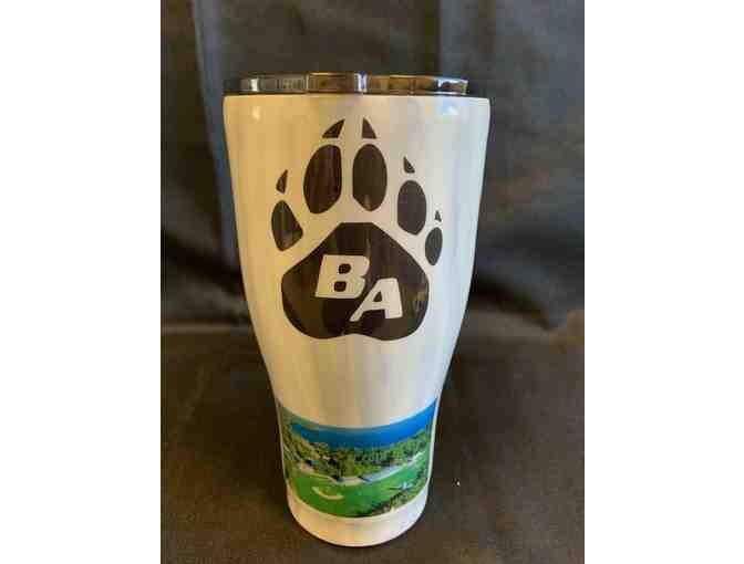 Keep beverages hot or cold for hours in this large-sized tumbler custom-made for Bridgton Academy! Features a picture of campus and the BA paw logo on one side and a map marking North Bridgton, ME on the other in an attractive marbled grey color.