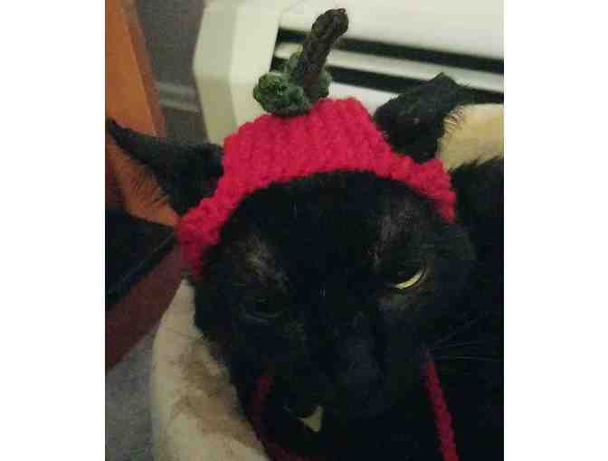 Hand-knit by our MRFRS Foster Care Coordinator. Fits an average size adult cat, ties below chin.