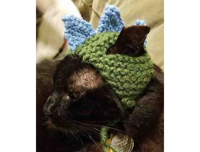 Hand-knit by our MRFRS Foster Care Coordinator. Fits an average size adult cat, ties below chin.