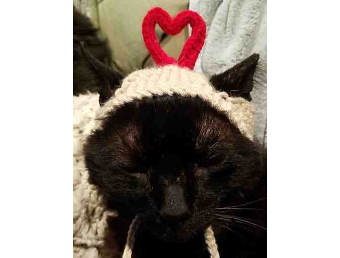 Hand-knit by our MRFRS Foster Care Coordinator. Fits an average size adult cat, ties below chin.