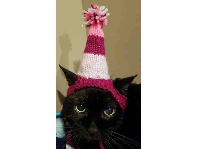 Hand-knit by our MRFRS Foster Care Coordinator. Fits an average size adult cat, ties below chin.