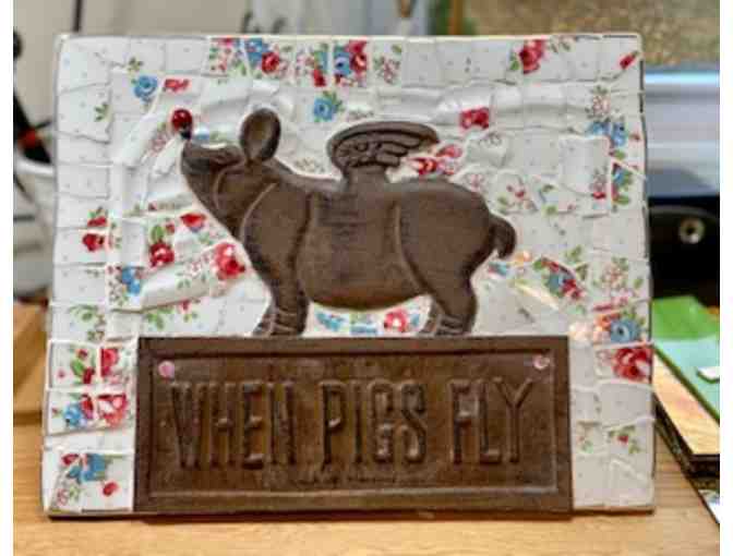 Picassette is a French term for "stolen from plate". Art made in this style can incorporate many forms of tessera (stone, china, glass, wood, bone, shells, jewelry...) This piece "When Pigs Fly" is mounted on wedi board, and incorporates broken china along with the cast iron plaque.