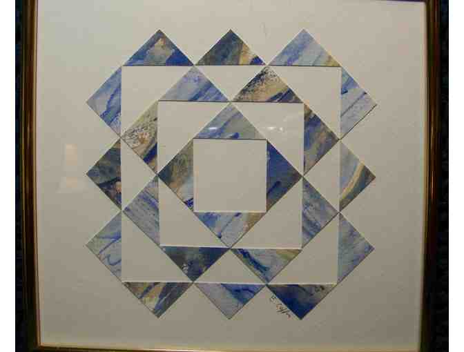 This beautiful artwork, based on a quilt pattern, is created from hand-cut original watercolor paintings. Measuring 8" x 8" in a gold metal frame, this original collage will bring a peaceful air to any room.