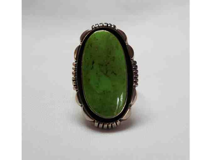 This large oval of green turquoise has an intriguing matrix in hues of brown to gold. Nice detail in the sterling silver setting. Back is marked Sterling. Ring size: 8 1/4