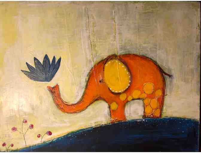 "Lucky Elephant" is an acrylic on wood painting donated and created by artist Jenny Schneider. Elephants symbolize good fortune, wisdom and unity and this little orange elephant adds a splash of fun!