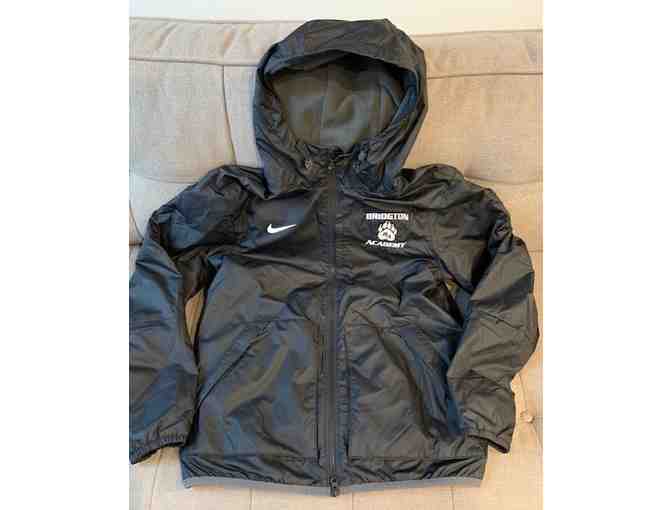 Lightweight yet warm Nike nylon jacket with thick fleece lining and hood. Two zippered front pockets and heavy-duty double zipper. Men's medium with classic Bridgton Academy pawprint logo on front chest.