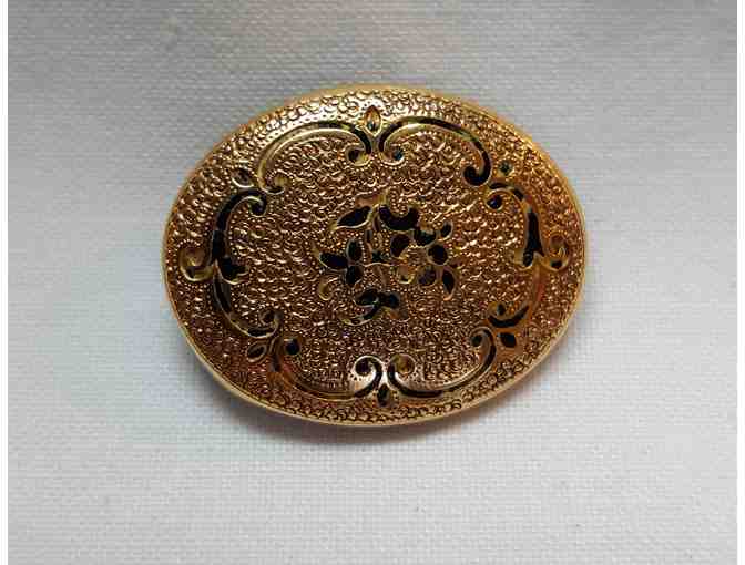This delicate brooch likely dates some time between the Victorian era and the 1920s. Complex gold floral patterns ordorn the front of the brooch which was likely once part of a locket converted to be worn as a pin. Lockets were very popular in the Victorian era, usually containing sentimental items such as a lock of hair or tiny portrait of a loved one. Brooch back still retains a loop for a chain.