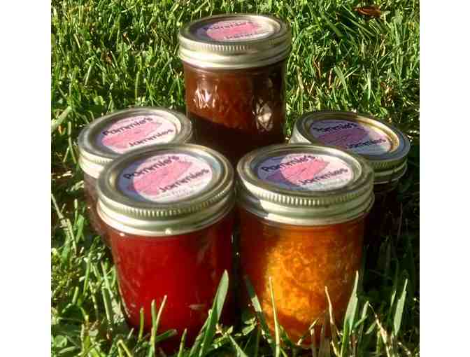 Four half-pint jars of Pammie's Jammies, and One 12-ounce jar of Apple Butter, Locally and organically home grown and homemade with love. From the garden and kitchen of Pam Davis, in Santa Rosa.