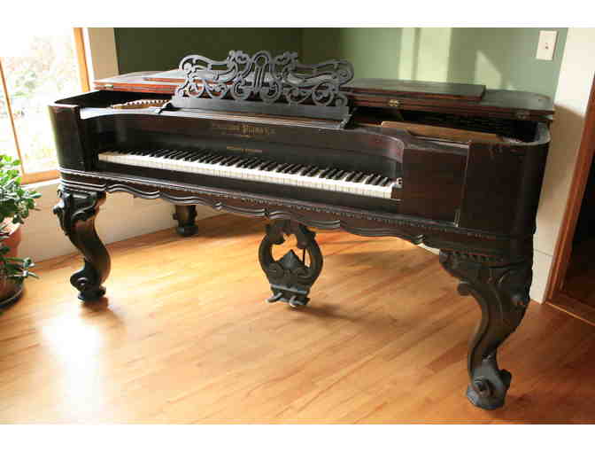 This beautiful Emerson square grand piano built circa 1875 is in good condition. The mechanics were cleaned and somewhat restored in 1997 by John A. Young of Glover, Vermont, who tuned and repaired it most recently in 2016. All of the keys function; the right pedal is functional but the left pedal is not.