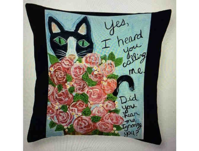This pillow is adorned with Jan Murphy's original artwork. It is 16" x 16" and printed on 100% spun polyester poplin fabric. Each pillow is printed on both sides and has a concealed zipper for easy cleaning.