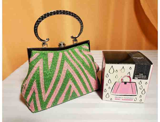 Vintage inspired pink and green, beaded purse with sculptured silver handle PLUS purse protector.