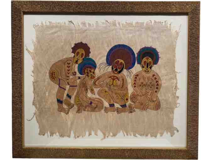 "Gathering of Women," from Fiji by Matenga Kingi. Masks, body painting, and tattooing is a big part of Oceania's "living art." This piece showcases the closeness of women in the Fijian indigenous community. It is printed on tapa, also known as masi, made from the bark of the paper mulberry tree.