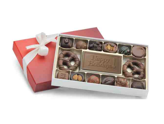 A great selection of Sweet Design's finest chocolates personalized with a business-card-size bar of chocolate with a "Happy Holidays" message!