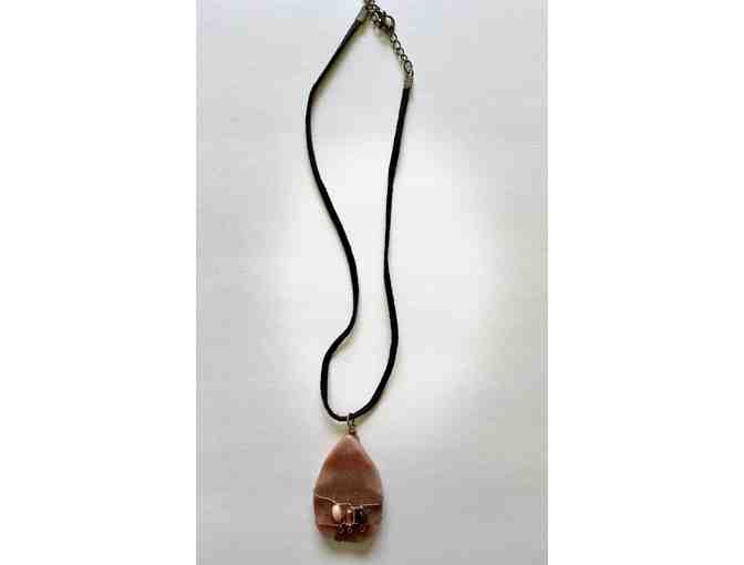 For the love of natural stone jewelry, a warm large stone is embellished with three smaller stones in wire wrapping. This necklace is adjustable in length, so versatile to wear with any neckline. Offered by an anonymous donor.