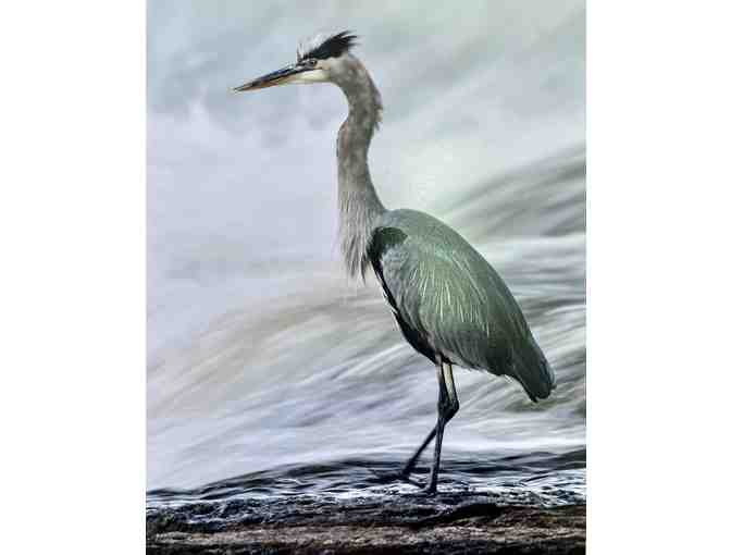 A stunning capture of a Great Blue Heron standing on the edge of a flowing stream, scanning the water for a meal along the West Canada Creek. We love these birds, often seen in Tug Hill region during our warmer seasons. Offered by local talented local photographer, Pamela Underhill Karaz. Unframed pring measures 8" x 10".