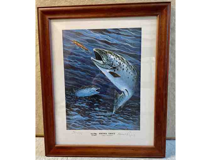 Matted, framed, and signed, this Brown Trout print by renowned river artist Michael Ringer is made for the fish, game and wildlife lover. This piece is 19.5" x 23.5", including the frame.