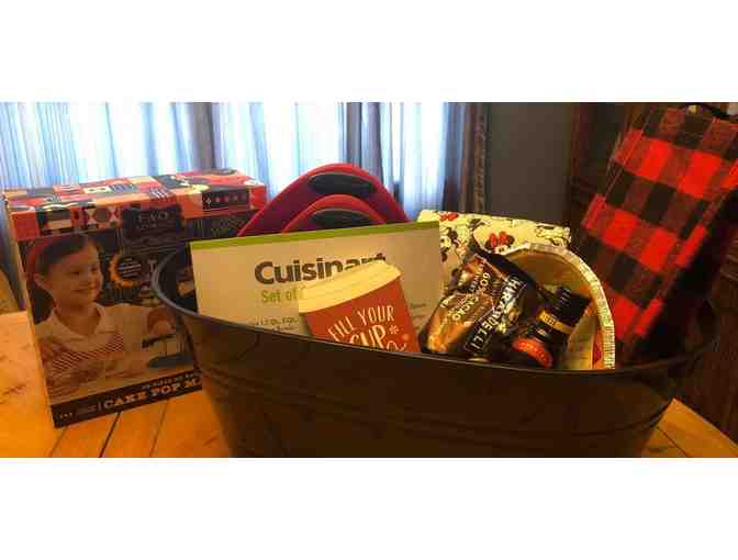 Package includes dry ingredients plus recipe for black bottom pie, cake pop kit for ages 6 and up, cousin art mix bowls & towels, and for the hero of the hour, a bottle of Spatlese (German white wine).