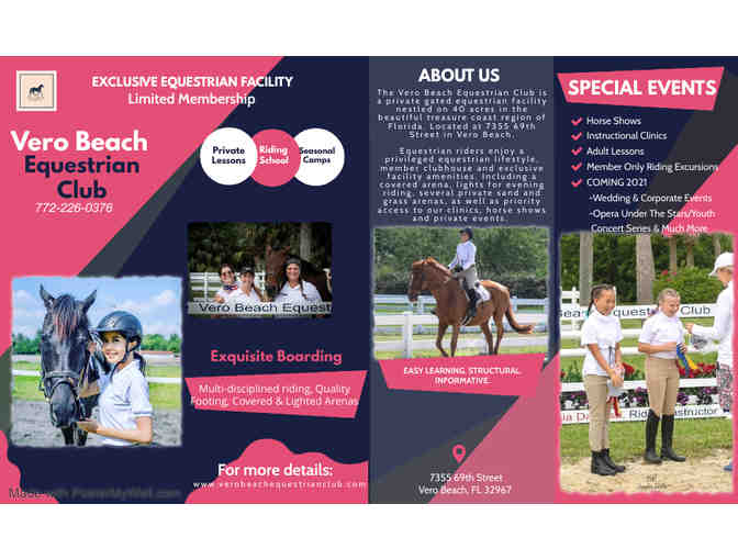 For all the young equestrian lovers out there! Come on out to the Vero Beach Equestrian Club, a private gated equestrian facility located on 40 acres, which provides beginner riding camps and more. Your young rider will enjoy a private ride with a certified trainer, along with hands on exercising, grooming, and pony care for 1.5 hours.