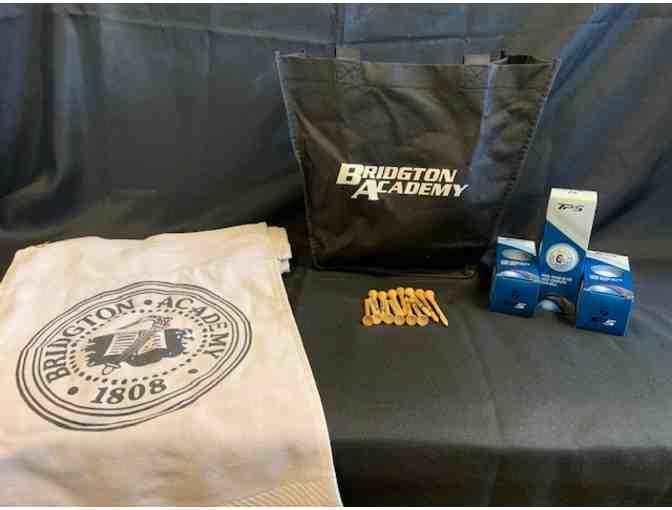 Custom Taylor Made TP5 golf balls with Bridgton Academy seal, Bridgton Academy golf tees, and three Bridgton seal grey towels, all in a Bridgton bag ready for gift giving.
