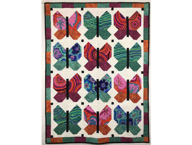 Gorgeous butterfly quilt donated by local quilter Jan Floto. This quilt is made of Kaffe Fassett fabrics, and is machine top quilted. Add this beauty to your space today!