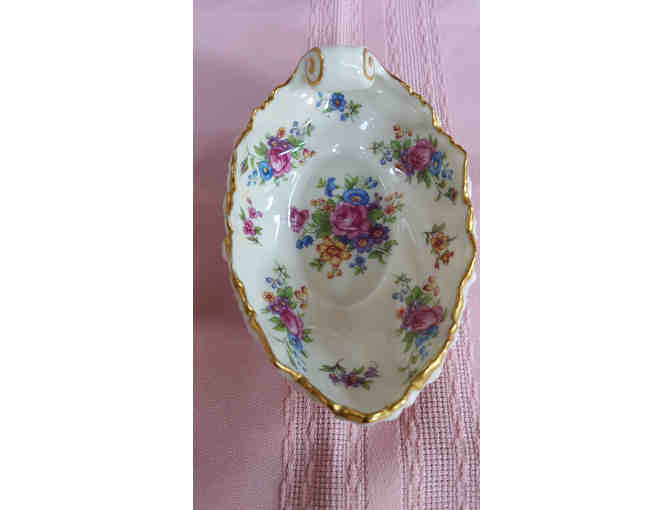 This delicate bowl is one of Lenox's Rose collection. It is decorated with posies of pink, blue, violet and yellow flowers and trimmed with gold along the scrolled leaf stem and the edge. It was originally designed to hold jewelry, but is a lovely piece on its own or to hold any small pieces.