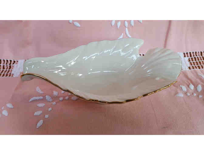 This lovely Lenox dish is shaped like a dove, with wings, tail, beak and faint feather markings. It is cream with 24-karat gold trim along the top. It is flawless, without any signs of wear.