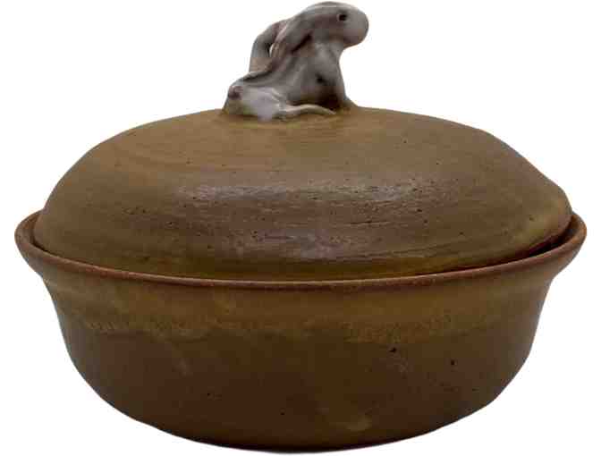 This butter dish was made by local potter Barbara Moraff and features a rabbit handle on the lid.