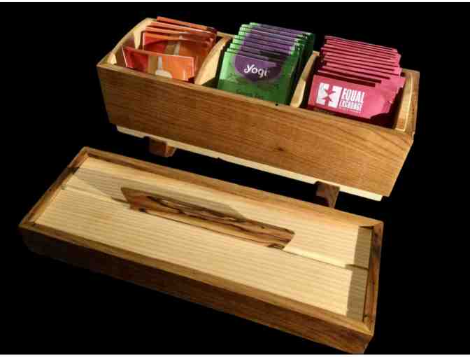 This lovely little tea box is made from butternut with ash and spalted maple accents and features three compartments for teabags.