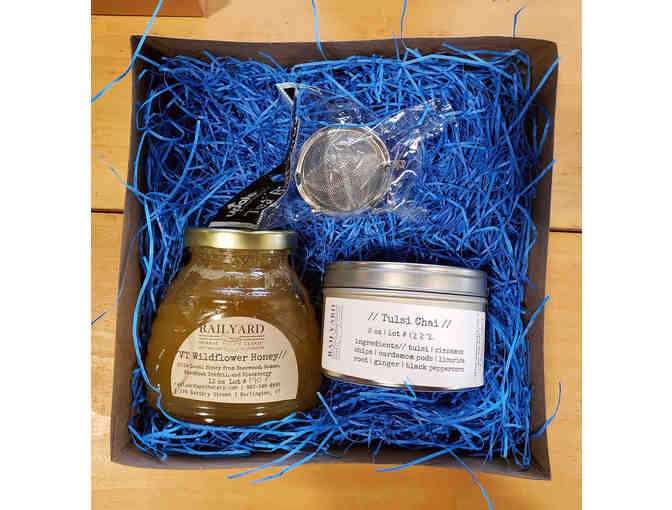An attractive gift box of loose herbal tea, tea ball and honey - everything you need for many cups of delicious, high-quality of herbal tea. The tea blend included is "tulsi chai" - an uplifting blend with warming chai spices and licorice. Non-caffeinated. The honey is local, raw VT honey. Enjoy!