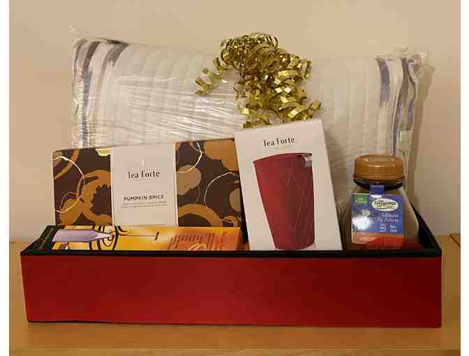 Send a warm hug to a loved one with this luxurious gift basket! Basket includes: Natori soft neck pillow, tea set with lidded cup, pumpkin spice tea, hand held frother, and sweet chocolate-chocolate cocoa mix.