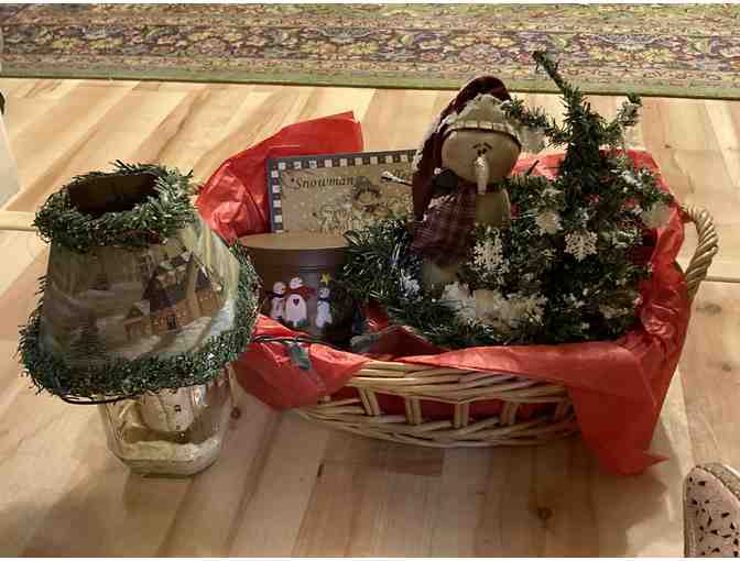 This seasonal basket for the home decor enthusiast includes a collection of items to cheer up any home for the holidays! You'll find a lamp, wall sign, decorated box, snowman and mini tree, all ready to adorn a mantel, table or shelf with Christmas coziness.