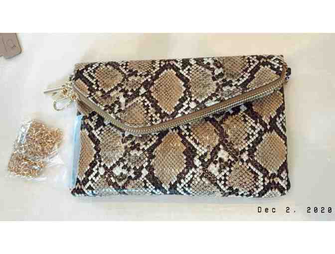 A Faux Leather stoned colored bag- Envelope clutch with gold chain paired with a neutral wrap bracelet, gold threader earrings, 2 - 24K face sheet masks and a leopard fleece spa headband.